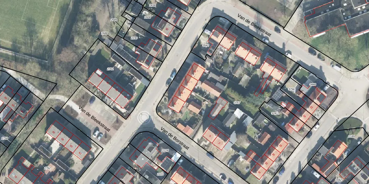 Het perceel waarop Van de Bleekstraat 29 staat heeft een oppervlakte van 4047 m². Dit is een zeer groot perceel. De perceeloppervlakte wordt geregistreerd door het Kadaster. Gedetailleerde informatie over de maten van dit perceel kunt u vinden in het rapport Kadastrale kaart met maatvoering van Van de Bleekstraat 29.