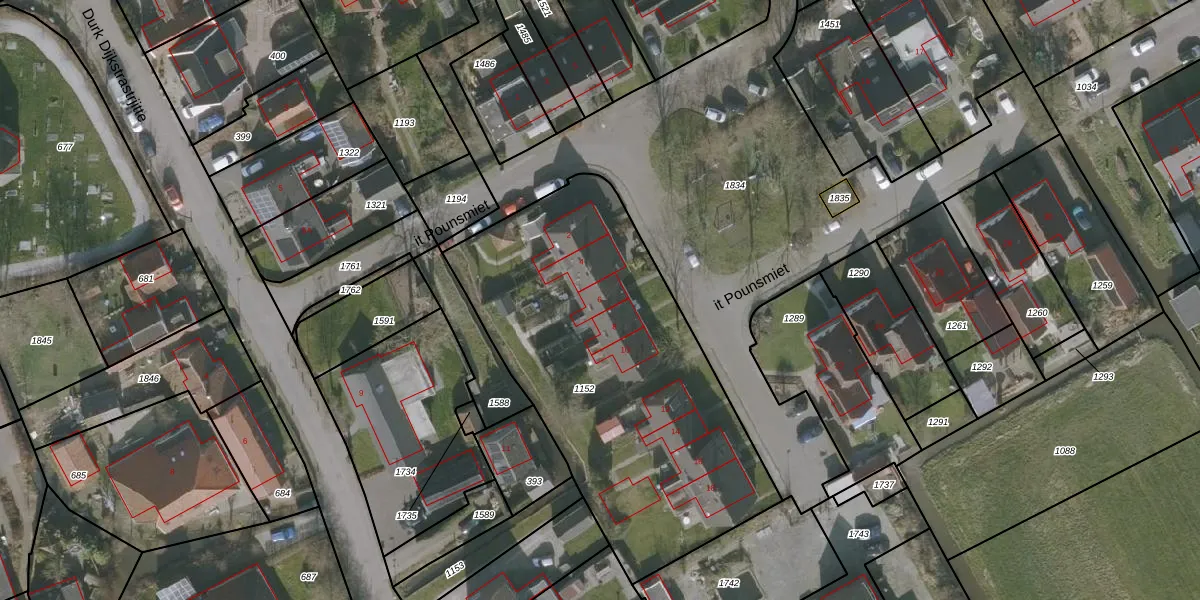 Het perceel waarop it Pounsmiet 6 staat heeft een oppervlakte van 1880 m². Dit is een zeer groot perceel. De perceeloppervlakte wordt geregistreerd door het Kadaster. Gedetailleerde informatie over de maten van dit perceel kunt u vinden in het rapport Kadastrale kaart met maatvoering van it Pounsmiet 6.