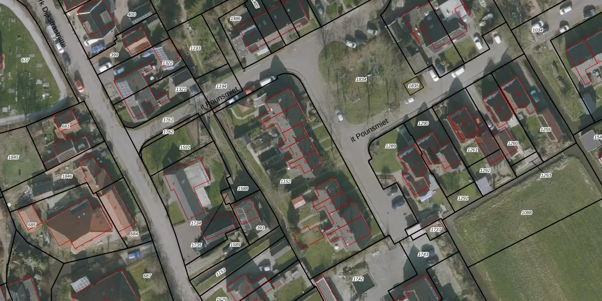 Het perceel waarop it Pounsmiet 8 staat heeft een oppervlakte van 1880 m². Dit is een zeer groot perceel. De perceeloppervlakte wordt geregistreerd door het Kadaster. Gedetailleerde informatie over de maten van dit perceel kunt u vinden in het rapport Kadastrale kaart met maatvoering van it Pounsmiet 8.