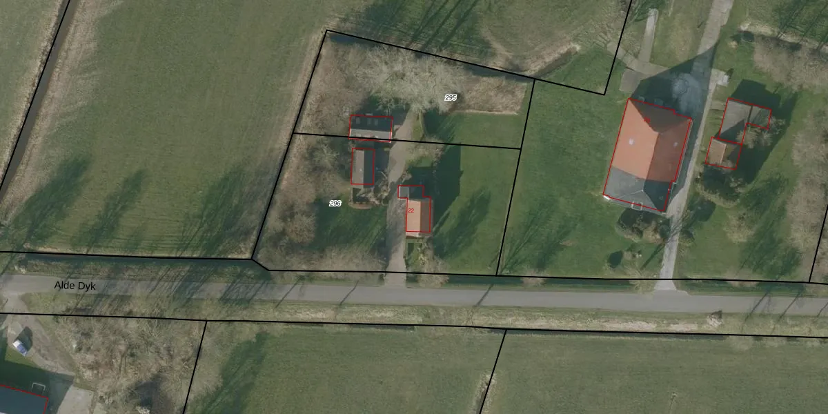 Alde Dyk 22 is gelegen op kadastraal perceel GRD00E296. Deze kadastrale aanduiding is uniek en wordt gebruikt door het Kadaster om eigendomsrechten en andere zakelijke rechten vast te leggen. Het perceel maakt onderdeel uit van de kadastrale gemeente Gorredijk.