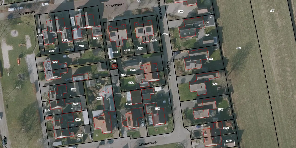 Mounesleat 4 is gelegen op kadastraal perceel GRD00B3752. Deze kadastrale aanduiding is uniek en wordt gebruikt door het Kadaster om eigendomsrechten en andere zakelijke rechten vast te leggen. Het perceel maakt onderdeel uit van de kadastrale gemeente Gorredijk.