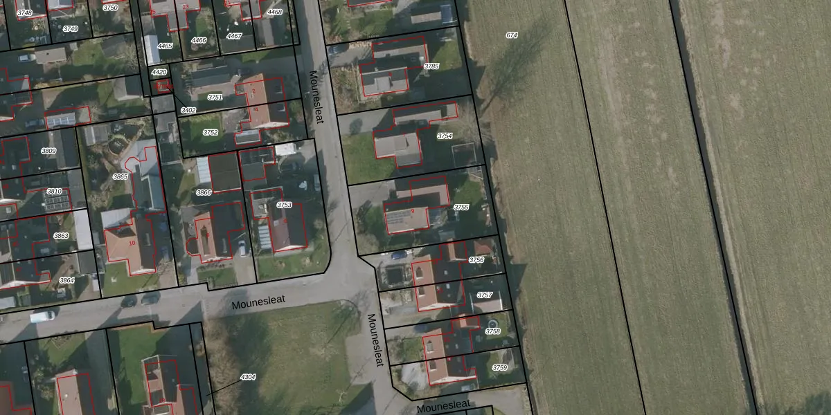 Mounesleat 9 is gelegen op kadastraal perceel GRD00B3755. Deze kadastrale aanduiding is uniek en wordt gebruikt door het Kadaster om eigendomsrechten en andere zakelijke rechten vast te leggen. Het perceel maakt onderdeel uit van de kadastrale gemeente Gorredijk.
