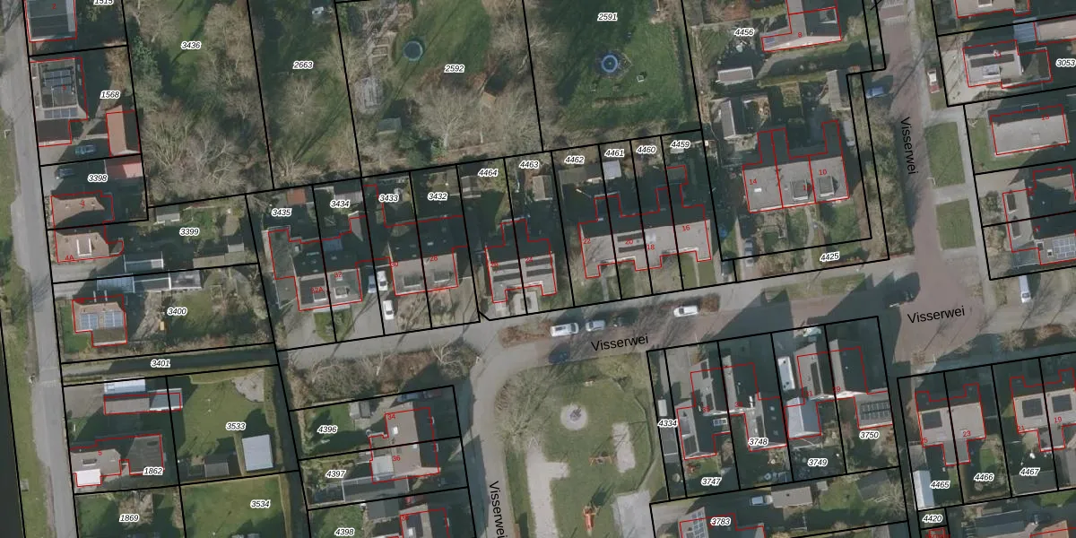 Visserwei 24 is gelegen op kadastraal perceel GRD00B4463. Deze kadastrale aanduiding is uniek en wordt gebruikt door het Kadaster om eigendomsrechten en andere zakelijke rechten vast te leggen. Het perceel maakt onderdeel uit van de kadastrale gemeente Gorredijk.