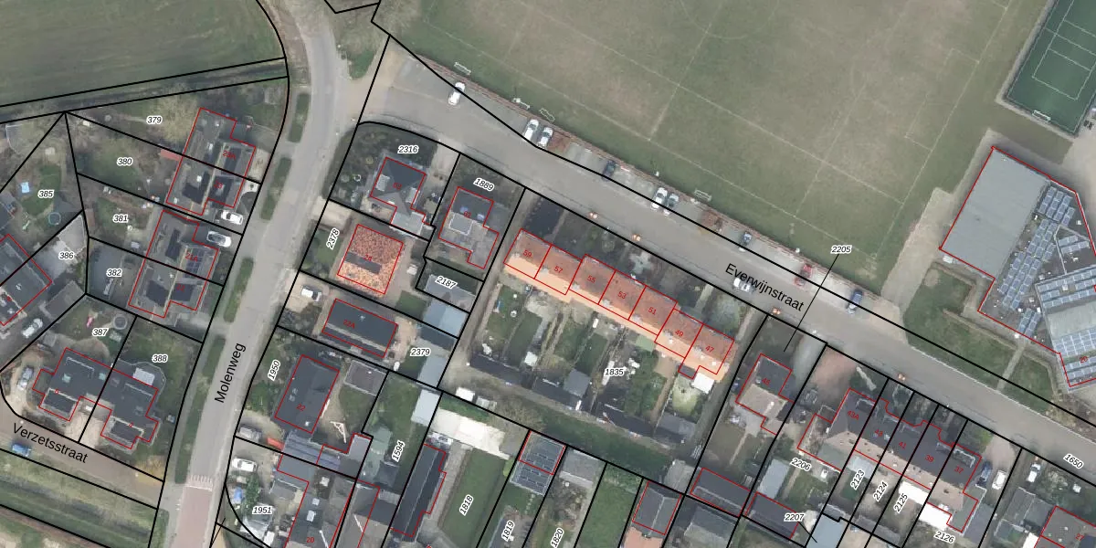 Het perceel waarop Everwijnstraat 57 staat heeft een oppervlakte van 1780 m². Dit is een zeer groot perceel. De perceeloppervlakte wordt geregistreerd door het Kadaster. Gedetailleerde informatie over de maten van dit perceel kunt u vinden in het rapport Kadastrale kaart met maatvoering van Everwijnstraat 57.