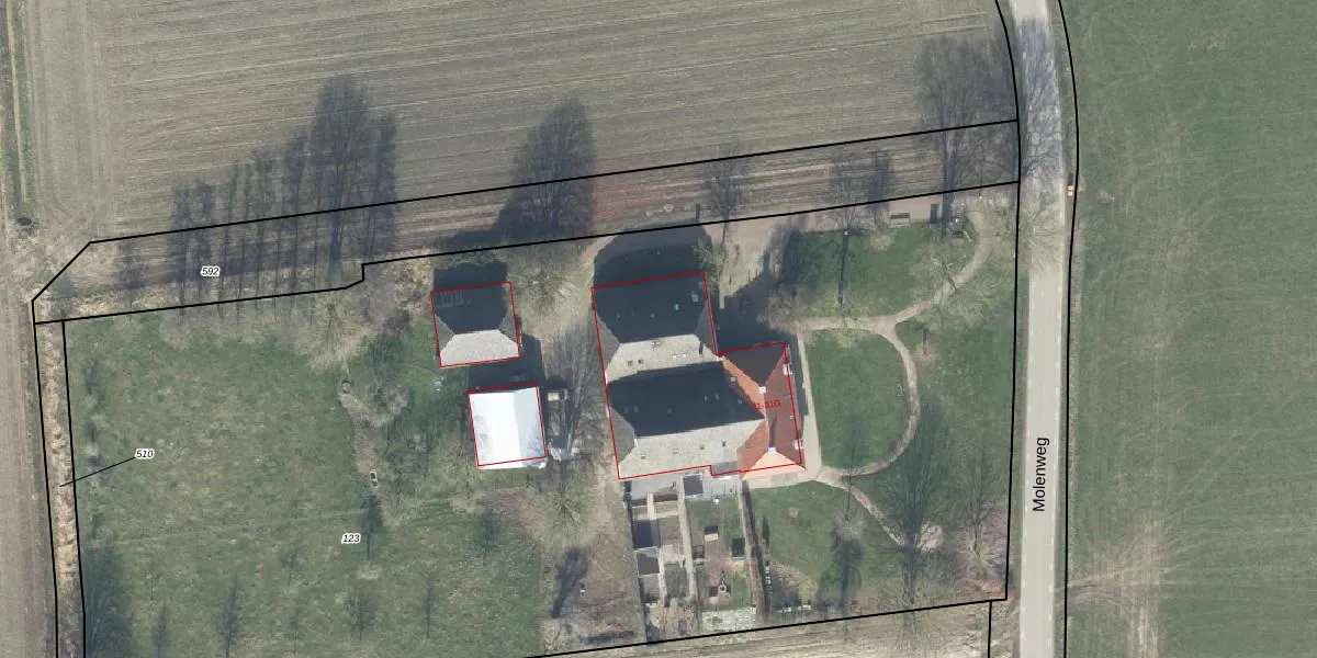 Het perceel waarop Molenweg 31-A staat heeft een oppervlakte van 8870 m². Dit is een zeer groot perceel. De perceeloppervlakte wordt geregistreerd door het Kadaster. Gedetailleerde informatie over de maten van dit perceel kunt u vinden in het rapport Kadastrale kaart met maatvoering van Molenweg 31-A.