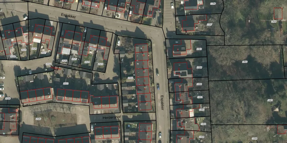 Het perceel waarop Espakker 65 staat heeft een oppervlakte van 1225 m². Dit is een zeer groot perceel. De perceeloppervlakte wordt geregistreerd door het Kadaster. Gedetailleerde informatie over de maten van dit perceel kunt u vinden in het rapport Kadastrale kaart met maatvoering van Espakker 65.