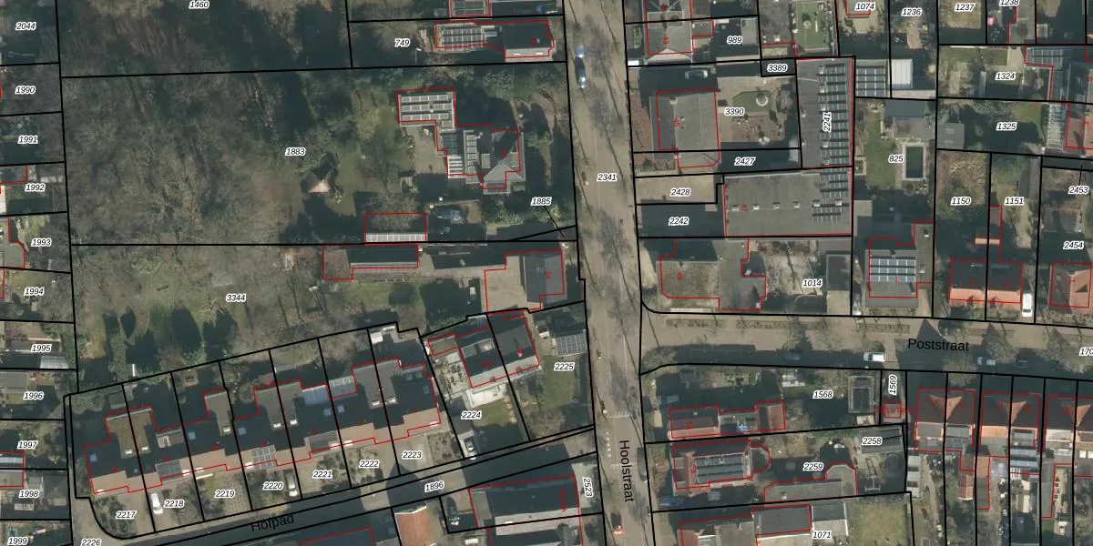 Het perceel waarop Hoolstraat 34 staat heeft een oppervlakte van 1692 m². Dit is een zeer groot perceel. De perceeloppervlakte wordt geregistreerd door het Kadaster. Gedetailleerde informatie over de maten van dit perceel kunt u vinden in het rapport Kadastrale kaart met maatvoering van Hoolstraat 34.