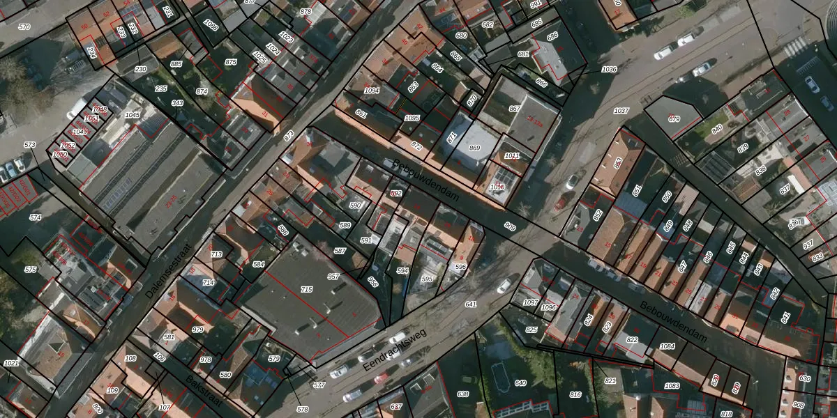 Bebouwdendam 14 is gelegen op kadastraal perceel TLN00R594. Deze kadastrale aanduiding is uniek en wordt gebruikt door het Kadaster om eigendomsrechten en andere zakelijke rechten vast te leggen. Het perceel maakt onderdeel uit van de kadastrale gemeente Tholen.