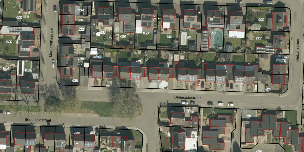 Benedictastraat 15 is gelegen op kadastraal perceel THO00A4577. Deze kadastrale aanduiding is uniek en wordt gebruikt door het Kadaster om eigendomsrechten en andere zakelijke rechten vast te leggen. Het perceel maakt onderdeel uit van de kadastrale gemeente Thorn.