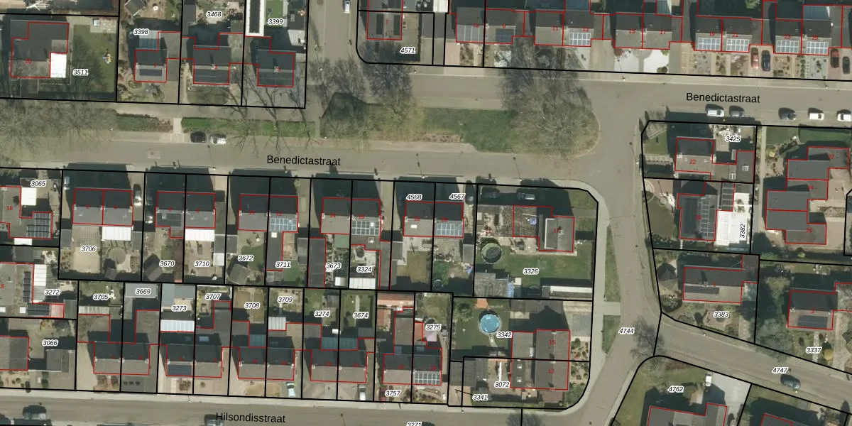 Benedictastraat 18 is gelegen op kadastraal perceel THO00A4568. Deze kadastrale aanduiding is uniek en wordt gebruikt door het Kadaster om eigendomsrechten en andere zakelijke rechten vast te leggen. Het perceel maakt onderdeel uit van de kadastrale gemeente Thorn.