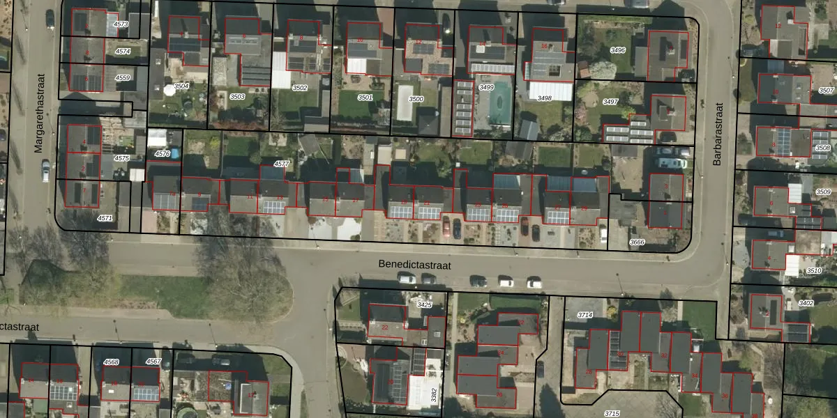 Benedictastraat 21 is gelegen op kadastraal perceel THO00A4577. Deze kadastrale aanduiding is uniek en wordt gebruikt door het Kadaster om eigendomsrechten en andere zakelijke rechten vast te leggen. Het perceel maakt onderdeel uit van de kadastrale gemeente Thorn.