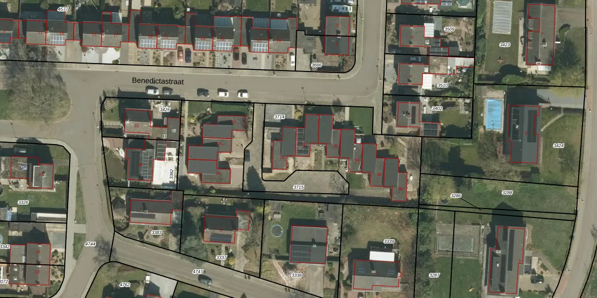 Benedictastraat 30 is gelegen op kadastraal perceel THO00A3714. Deze kadastrale aanduiding is uniek en wordt gebruikt door het Kadaster om eigendomsrechten en andere zakelijke rechten vast te leggen. Het perceel maakt onderdeel uit van de kadastrale gemeente Thorn.
