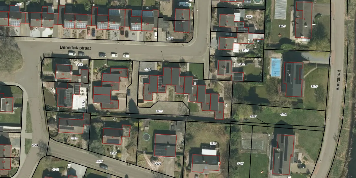 Benedictastraat 32 is gelegen op kadastraal perceel THO00A3714. Deze kadastrale aanduiding is uniek en wordt gebruikt door het Kadaster om eigendomsrechten en andere zakelijke rechten vast te leggen. Het perceel maakt onderdeel uit van de kadastrale gemeente Thorn.