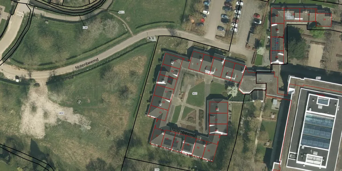 Notenbeemd 15 is gelegen op kadastraal perceel THO00C802. Deze kadastrale aanduiding is uniek en wordt gebruikt door het Kadaster om eigendomsrechten en andere zakelijke rechten vast te leggen. Het perceel maakt onderdeel uit van de kadastrale gemeente Thorn.