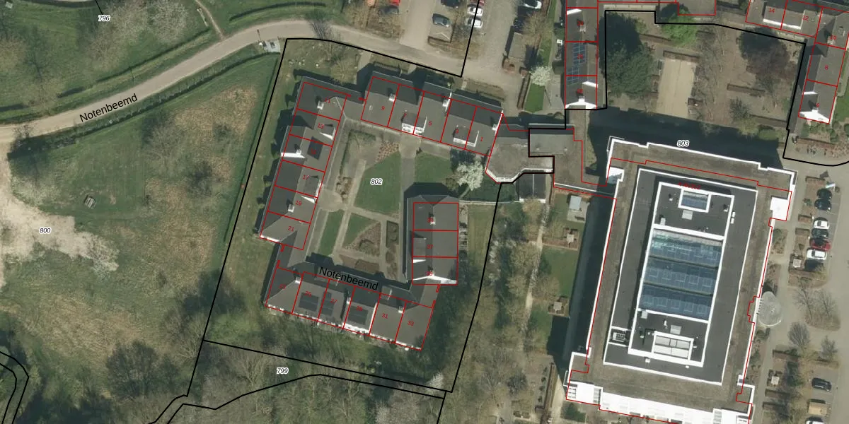 Notenbeemd 39 is gelegen op kadastraal perceel THO00C802. Deze kadastrale aanduiding is uniek en wordt gebruikt door het Kadaster om eigendomsrechten en andere zakelijke rechten vast te leggen. Het perceel maakt onderdeel uit van de kadastrale gemeente Thorn.