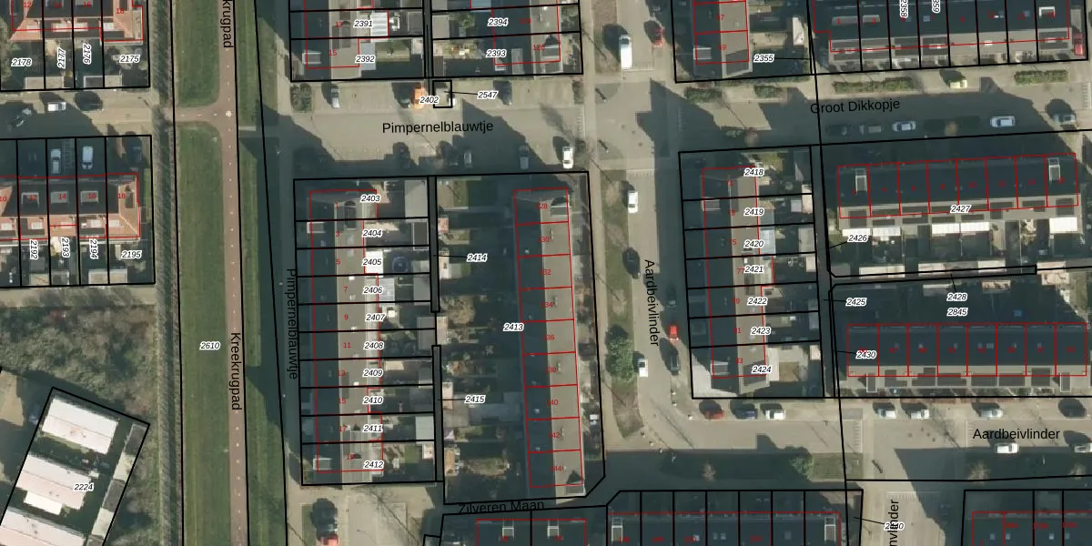 Aardbeivlinder 132 is gelegen op kadastraal perceel TIE00K2413. Deze kadastrale aanduiding is uniek en wordt gebruikt door het Kadaster om eigendomsrechten en andere zakelijke rechten vast te leggen. Het perceel maakt onderdeel uit van de kadastrale gemeente Tiel.