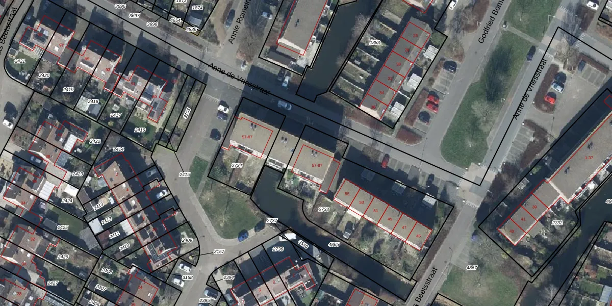 Het perceel waarop Anne de Vriesstraat 59 staat heeft een oppervlakte van 1353 m². Dit is een zeer groot perceel. De perceeloppervlakte wordt geregistreerd door het Kadaster. Gedetailleerde informatie over de maten van dit perceel kunt u vinden in het rapport Kadastrale kaart met maatvoering van Anne de Vriesstraat 59.