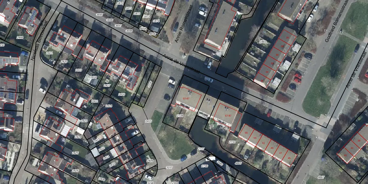 Het perceel waarop Anne de Vriesstraat 63 staat heeft een oppervlakte van 430 m². Dit is een groot perceel. De perceeloppervlakte wordt geregistreerd door het Kadaster. Gedetailleerde informatie over de maten van dit perceel kunt u vinden in het rapport Kadastrale kaart met maatvoering van Anne de Vriesstraat 63.