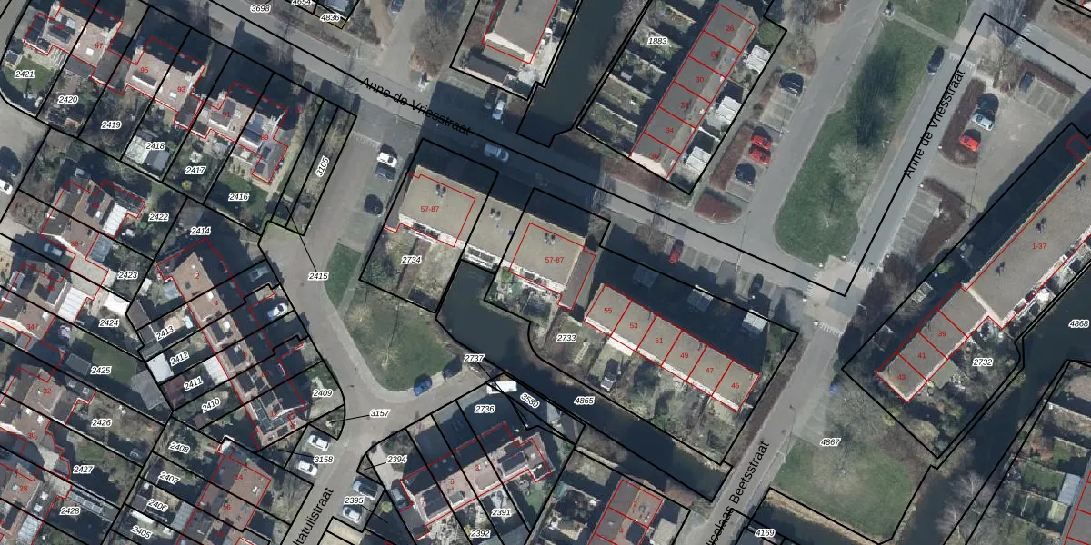 Het perceel waarop Anne de Vriesstraat 67 staat heeft een oppervlakte van 1353 m². Dit is een zeer groot perceel. De perceeloppervlakte wordt geregistreerd door het Kadaster. Gedetailleerde informatie over de maten van dit perceel kunt u vinden in het rapport Kadastrale kaart met maatvoering van Anne de Vriesstraat 67.