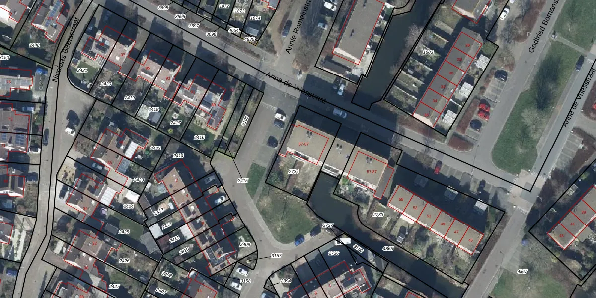 Het perceel waarop Anne de Vriesstraat 85 staat heeft een oppervlakte van 430 m². Dit is een groot perceel. De perceeloppervlakte wordt geregistreerd door het Kadaster. Gedetailleerde informatie over de maten van dit perceel kunt u vinden in het rapport Kadastrale kaart met maatvoering van Anne de Vriesstraat 85.
