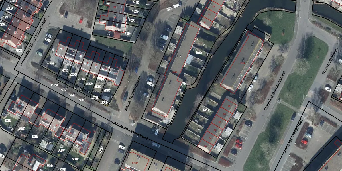 Het perceel waarop Annie Romeinstraat 14 staat heeft een oppervlakte van 2095 m². Dit is een zeer groot perceel. De perceeloppervlakte wordt geregistreerd door het Kadaster. Gedetailleerde informatie over de maten van dit perceel kunt u vinden in het rapport Kadastrale kaart met maatvoering van Annie Romeinstraat 14.