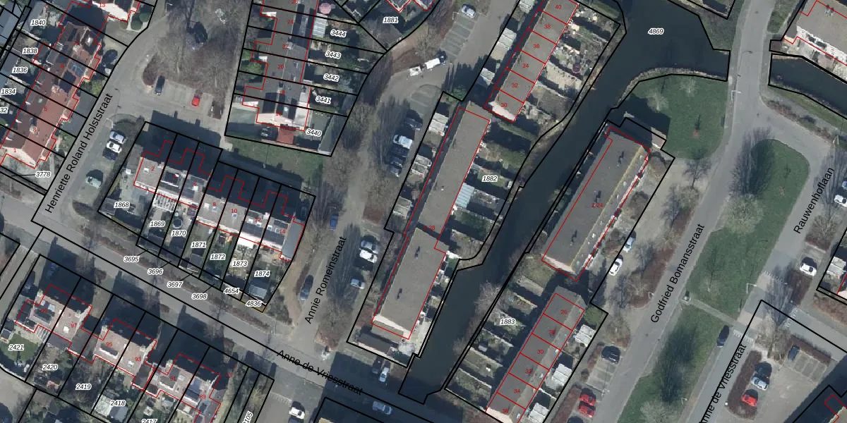 Het perceel waarop Annie Romeinstraat 20 staat heeft een oppervlakte van 2095 m². Dit is een zeer groot perceel. De perceeloppervlakte wordt geregistreerd door het Kadaster. Gedetailleerde informatie over de maten van dit perceel kunt u vinden in het rapport Kadastrale kaart met maatvoering van Annie Romeinstraat 20.