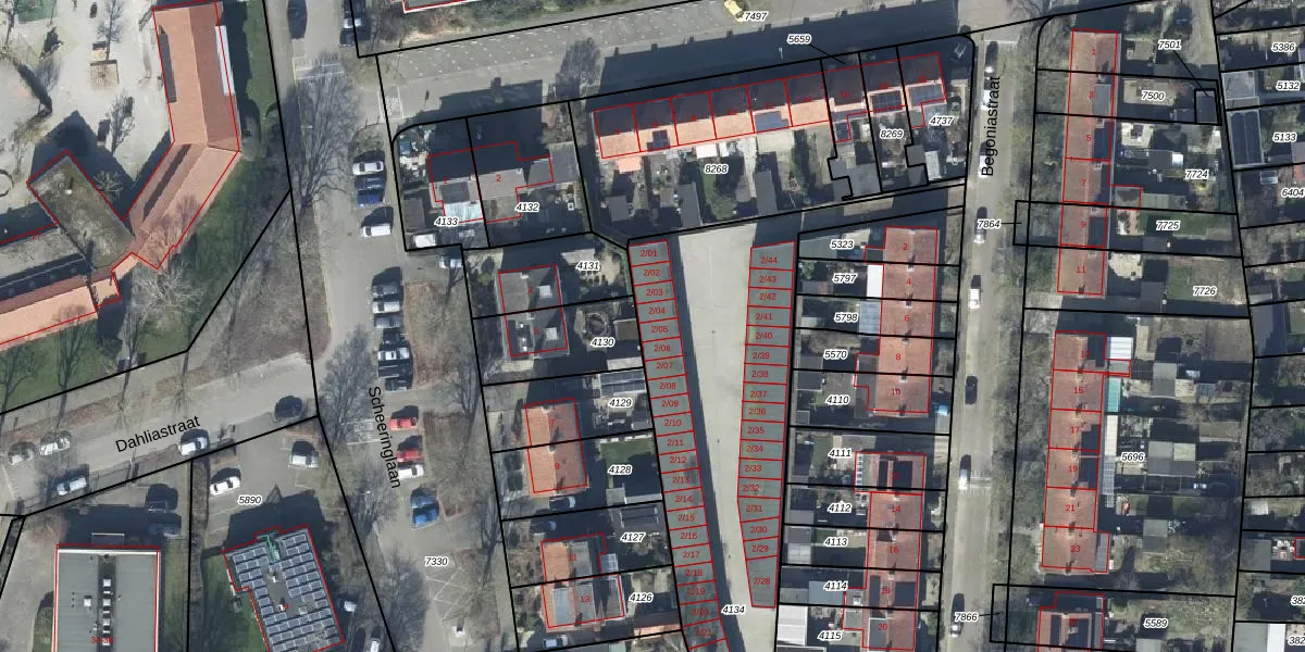 Het perceel waarop Begoniastraat 2-05 staat heeft een oppervlakte van 1615 m². Dit is een zeer groot perceel. De perceeloppervlakte wordt geregistreerd door het Kadaster. Gedetailleerde informatie over de maten van dit perceel kunt u vinden in het rapport Kadastrale kaart met maatvoering van Begoniastraat 2-05.