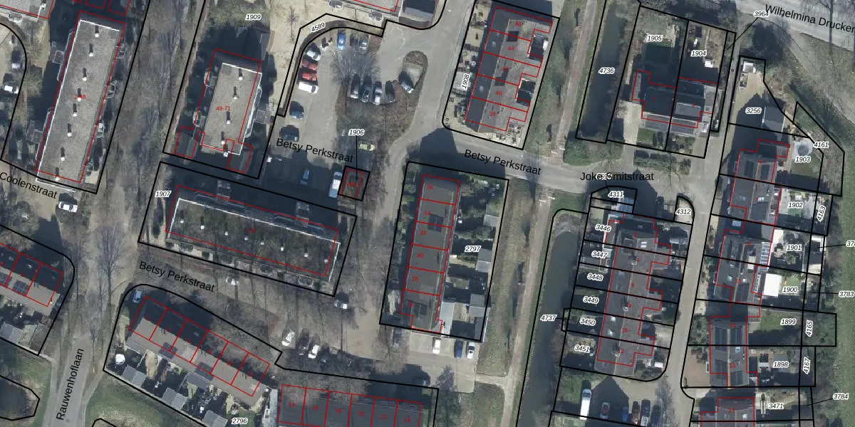 Het perceel waarop Betsy Perkstraat 34 staat heeft een oppervlakte van 915 m². Dit is een groot perceel. De perceeloppervlakte wordt geregistreerd door het Kadaster. Gedetailleerde informatie over de maten van dit perceel kunt u vinden in het rapport Kadastrale kaart met maatvoering van Betsy Perkstraat 34.