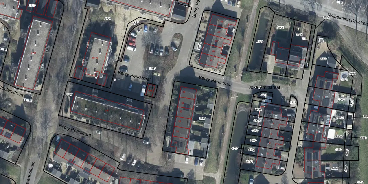 Het perceel waarop Betsy Perkstraat 36 staat heeft een oppervlakte van 915 m². Dit is een groot perceel. De perceeloppervlakte wordt geregistreerd door het Kadaster. Gedetailleerde informatie over de maten van dit perceel kunt u vinden in het rapport Kadastrale kaart met maatvoering van Betsy Perkstraat 36.