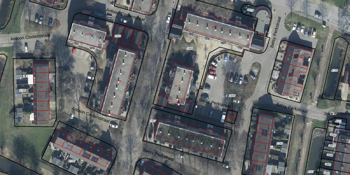 Het perceel waarop Betsy Perkstraat 59 staat heeft een oppervlakte van 2110 m². Dit is een zeer groot perceel. De perceeloppervlakte wordt geregistreerd door het Kadaster. Gedetailleerde informatie over de maten van dit perceel kunt u vinden in het rapport Kadastrale kaart met maatvoering van Betsy Perkstraat 59.