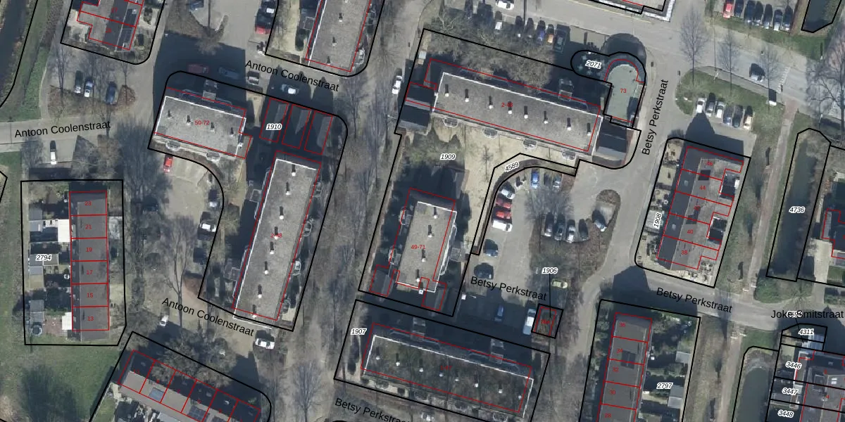 Het perceel waarop Betsy Perkstraat 63 staat heeft een oppervlakte van 2110 m². Dit is een zeer groot perceel. De perceeloppervlakte wordt geregistreerd door het Kadaster. Gedetailleerde informatie over de maten van dit perceel kunt u vinden in het rapport Kadastrale kaart met maatvoering van Betsy Perkstraat 63.