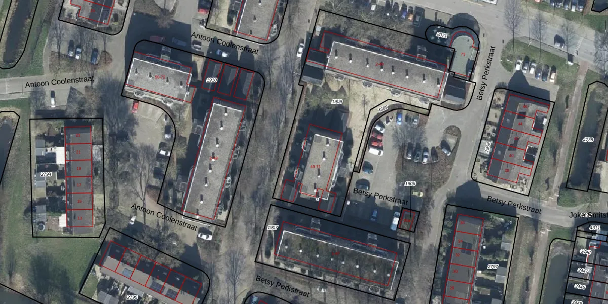 Het perceel waarop Betsy Perkstraat 69 staat heeft een oppervlakte van 2110 m². Dit is een zeer groot perceel. De perceeloppervlakte wordt geregistreerd door het Kadaster. Gedetailleerde informatie over de maten van dit perceel kunt u vinden in het rapport Kadastrale kaart met maatvoering van Betsy Perkstraat 69.