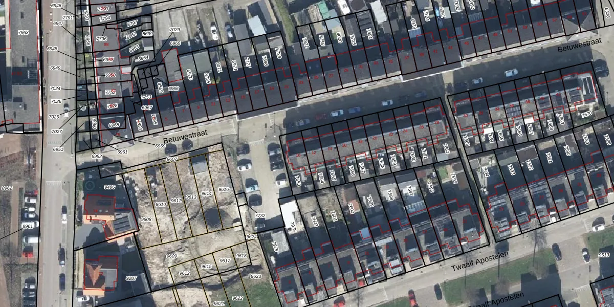 Het perceel waarop Betuwestraat 12 staat heeft een oppervlakte van 102 m². Dit is een middelgroot perceel. De perceeloppervlakte wordt geregistreerd door het Kadaster. Gedetailleerde informatie over de maten van dit perceel kunt u vinden in het rapport Kadastrale kaart met maatvoering van Betuwestraat 12.