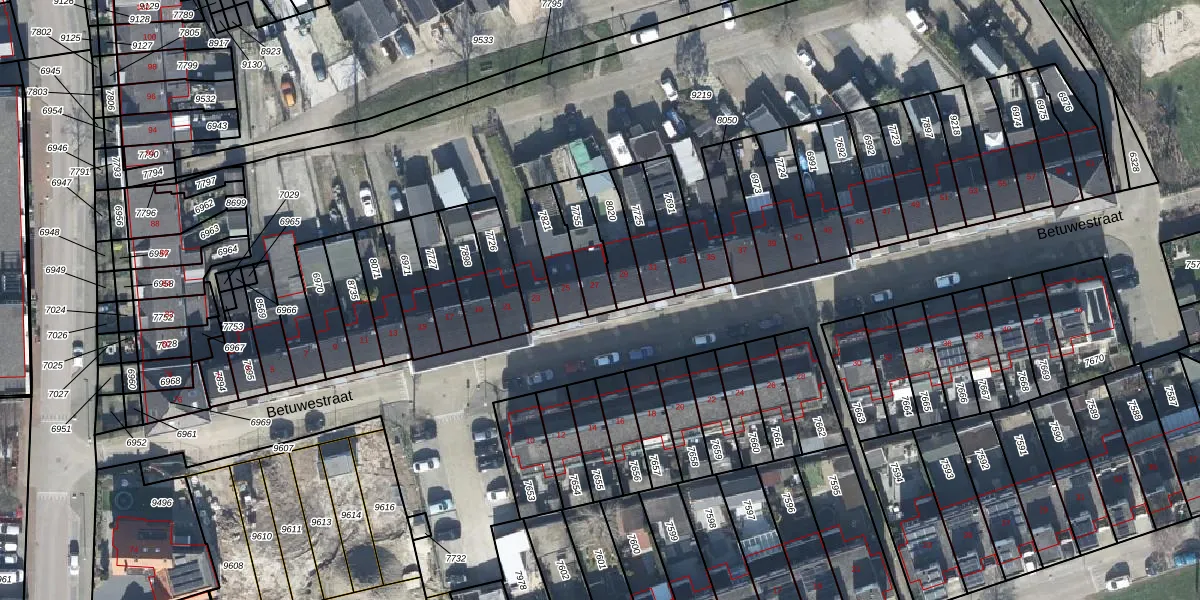 Het perceel waarop Betuwestraat 27 staat heeft een oppervlakte van 115 m². Dit is een middelgroot perceel. De perceeloppervlakte wordt geregistreerd door het Kadaster. Gedetailleerde informatie over de maten van dit perceel kunt u vinden in het rapport Kadastrale kaart met maatvoering van Betuwestraat 27.