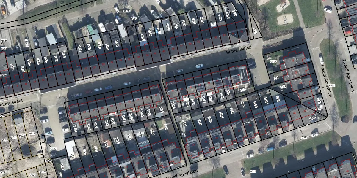 Het perceel waarop Betuwestraat 32 staat heeft een oppervlakte van 104 m². Dit is een middelgroot perceel. De perceeloppervlakte wordt geregistreerd door het Kadaster. Gedetailleerde informatie over de maten van dit perceel kunt u vinden in het rapport Kadastrale kaart met maatvoering van Betuwestraat 32.