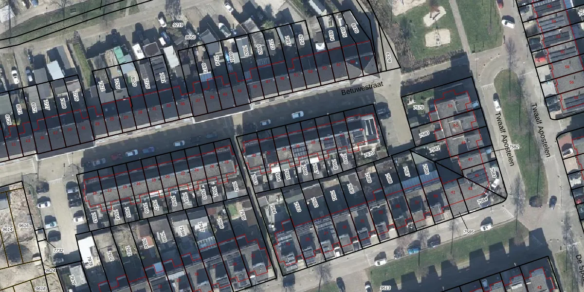 Het perceel waarop Betuwestraat 36 staat heeft een oppervlakte van 104 m². Dit is een middelgroot perceel. De perceeloppervlakte wordt geregistreerd door het Kadaster. Gedetailleerde informatie over de maten van dit perceel kunt u vinden in het rapport Kadastrale kaart met maatvoering van Betuwestraat 36.