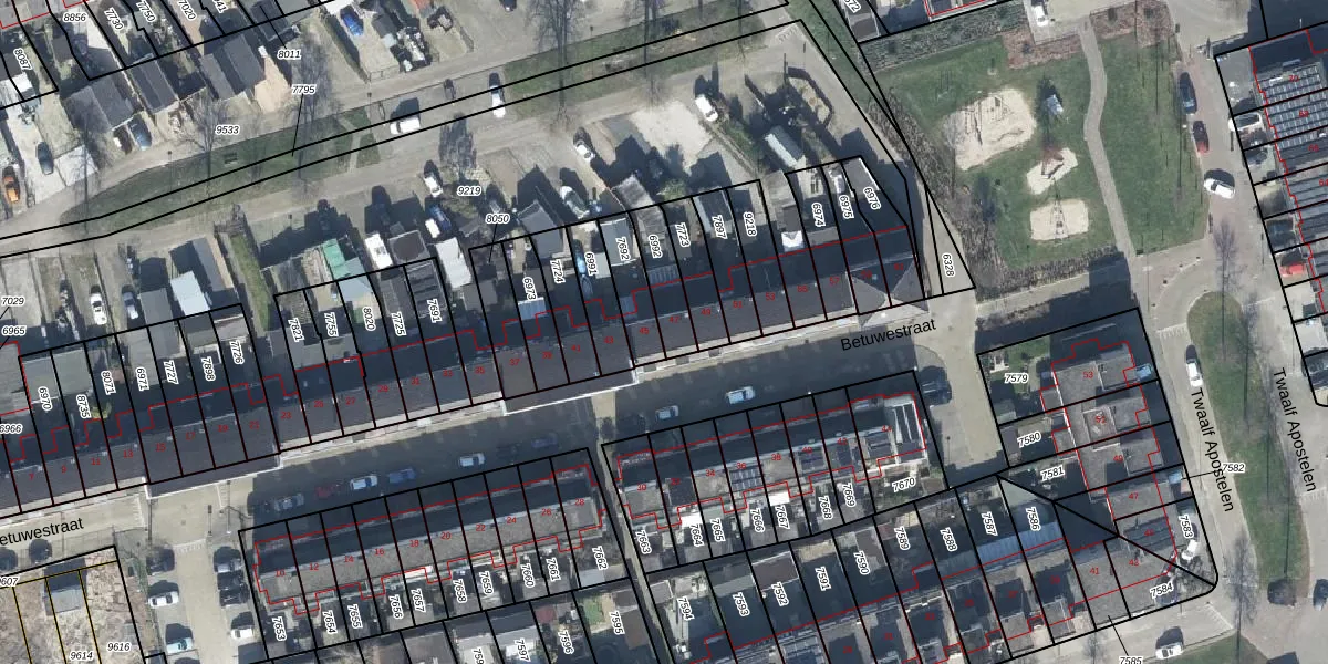 Het perceel waarop Betuwestraat 47 staat heeft een oppervlakte van 116 m². Dit is een middelgroot perceel. De perceeloppervlakte wordt geregistreerd door het Kadaster. Gedetailleerde informatie over de maten van dit perceel kunt u vinden in het rapport Kadastrale kaart met maatvoering van Betuwestraat 47.