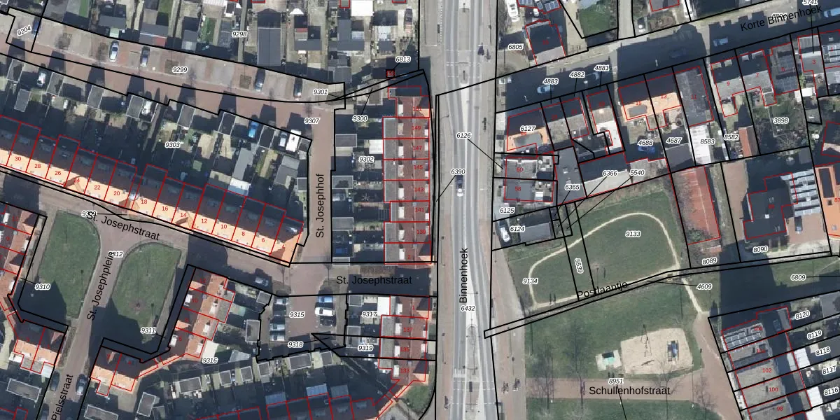 Binnenhoek 141 is gelegen op kadastraal perceel TIE00C9302. Deze kadastrale aanduiding is uniek en wordt gebruikt door het Kadaster om eigendomsrechten en andere zakelijke rechten vast te leggen. Het perceel maakt onderdeel uit van de kadastrale gemeente Tiel.