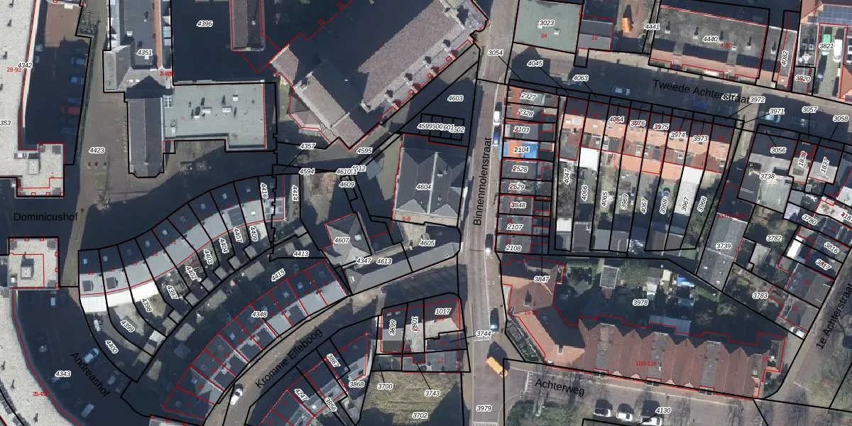 Het perceel waarop Binnenmolenstraat 8 staat heeft een oppervlakte van 427 m². Dit is een groot perceel. De perceeloppervlakte wordt geregistreerd door het Kadaster. Gedetailleerde informatie over de maten van dit perceel kunt u vinden in het rapport Kadastrale kaart met maatvoering van Binnenmolenstraat 8.