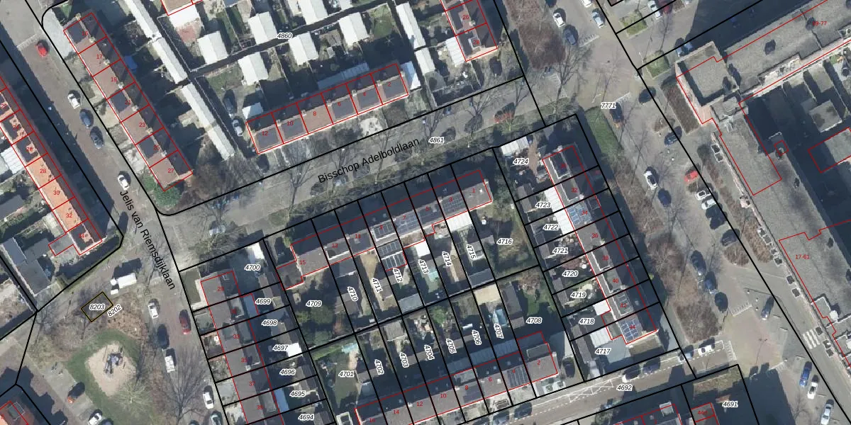 Gebruik de zoekbalk of klik op een perceel voor informatie over de adressen binnen dit perceel.