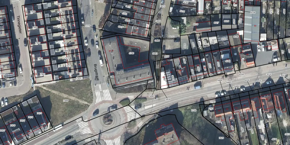 Brugstraat 59 is gelegen op kadastraal perceel TIE00D5780. Deze kadastrale aanduiding is uniek en wordt gebruikt door het Kadaster om eigendomsrechten en andere zakelijke rechten vast te leggen. Het perceel maakt onderdeel uit van de kadastrale gemeente Tiel.