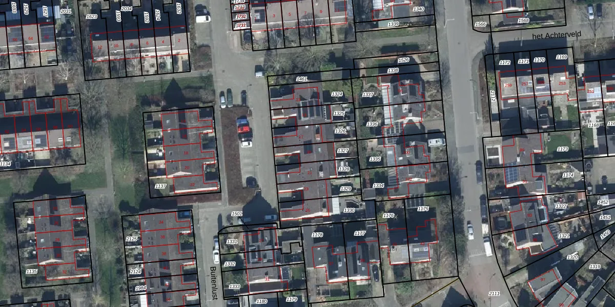 Het perceel waarop Buitenlust 19 staat heeft een oppervlakte van 163 m². Dit is een middelgroot perceel. De perceeloppervlakte wordt geregistreerd door het Kadaster. Gedetailleerde informatie over de maten van dit perceel kunt u vinden in het rapport Kadastrale kaart met maatvoering van Buitenlust 19.