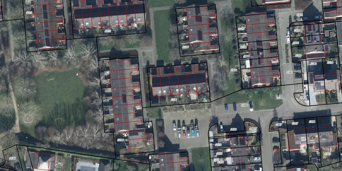 Buitenlust 56 is gelegen op kadastraal perceel TIE00G1136. Deze kadastrale aanduiding is uniek en wordt gebruikt door het Kadaster om eigendomsrechten en andere zakelijke rechten vast te leggen. Het perceel maakt onderdeel uit van de kadastrale gemeente Tiel.