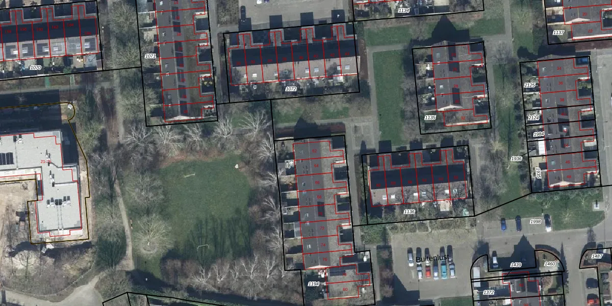 Het perceel waarop Buitenlust 62 staat heeft een oppervlakte van 1310 m². Dit is een zeer groot perceel. De perceeloppervlakte wordt geregistreerd door het Kadaster. Gedetailleerde informatie over de maten van dit perceel kunt u vinden in het rapport Kadastrale kaart met maatvoering van Buitenlust 62.