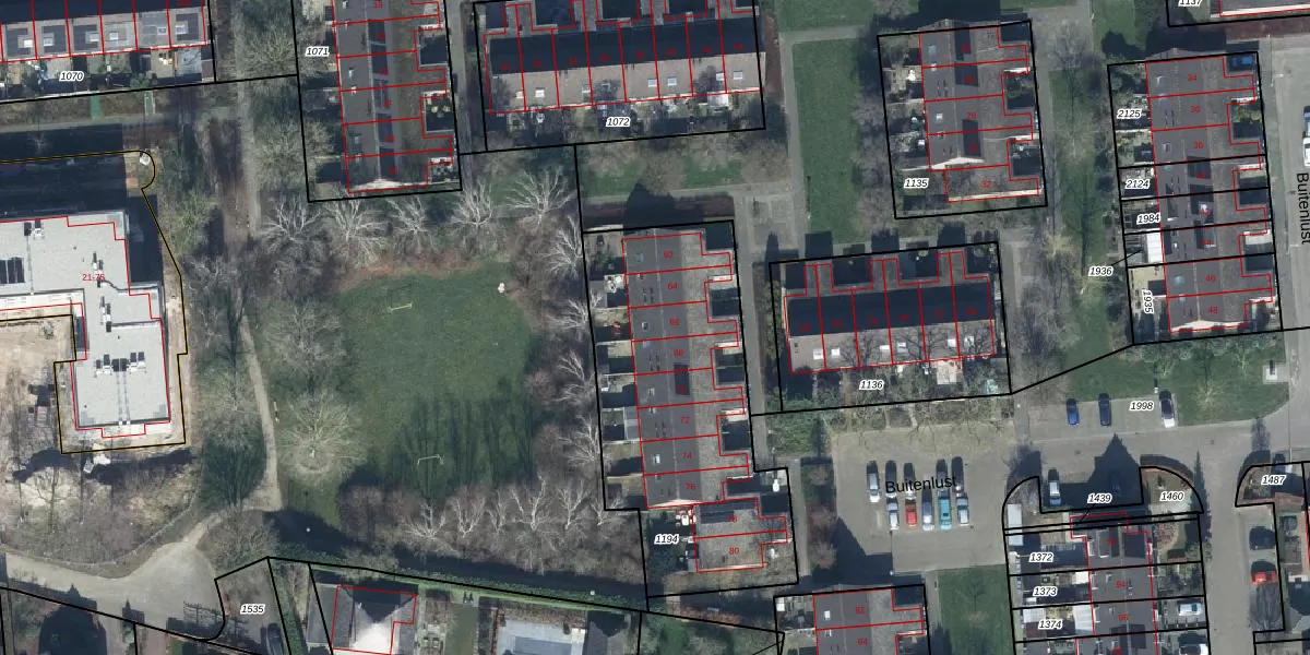 Het perceel waarop Buitenlust 66 staat heeft een oppervlakte van 1310 m². Dit is een zeer groot perceel. De perceeloppervlakte wordt geregistreerd door het Kadaster. Gedetailleerde informatie over de maten van dit perceel kunt u vinden in het rapport Kadastrale kaart met maatvoering van Buitenlust 66.