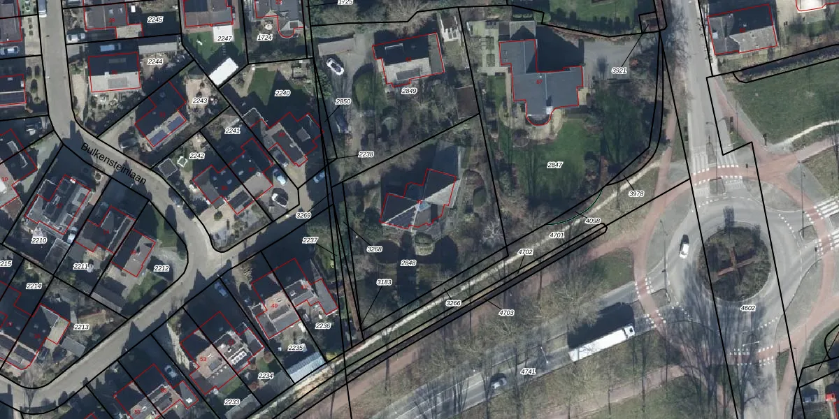 Het perceel waarop Bulkensteinlaan 45 staat heeft een oppervlakte van 1225 m². Dit is een zeer groot perceel. De perceeloppervlakte wordt geregistreerd door het Kadaster. Gedetailleerde informatie over de maten van dit perceel kunt u vinden in het rapport Kadastrale kaart met maatvoering van Bulkensteinlaan 45.