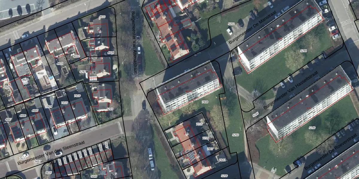 Burgemeester De Manstraat 65 is gelegen op kadastraal perceel TIE00D7808. Deze kadastrale aanduiding is uniek en wordt gebruikt door het Kadaster om eigendomsrechten en andere zakelijke rechten vast te leggen. Het perceel maakt onderdeel uit van de kadastrale gemeente Tiel.