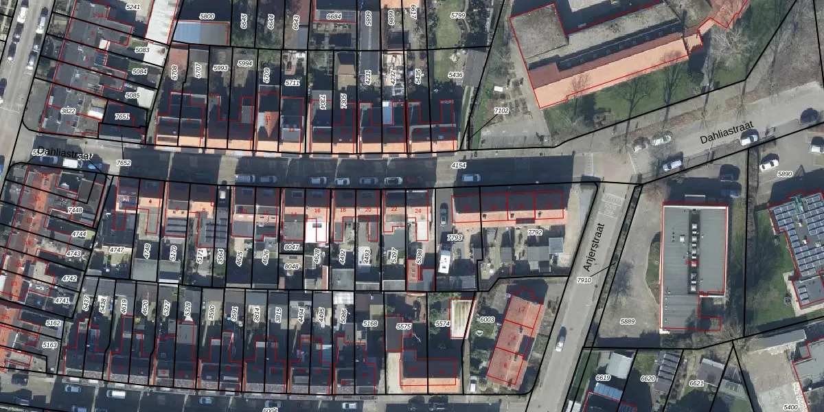 Het perceel waarop Dahliastraat 24 staat heeft een oppervlakte van 181 m². Dit is een middelgroot perceel. De perceeloppervlakte wordt geregistreerd door het Kadaster. Gedetailleerde informatie over de maten van dit perceel kunt u vinden in het rapport Kadastrale kaart met maatvoering van Dahliastraat 24.