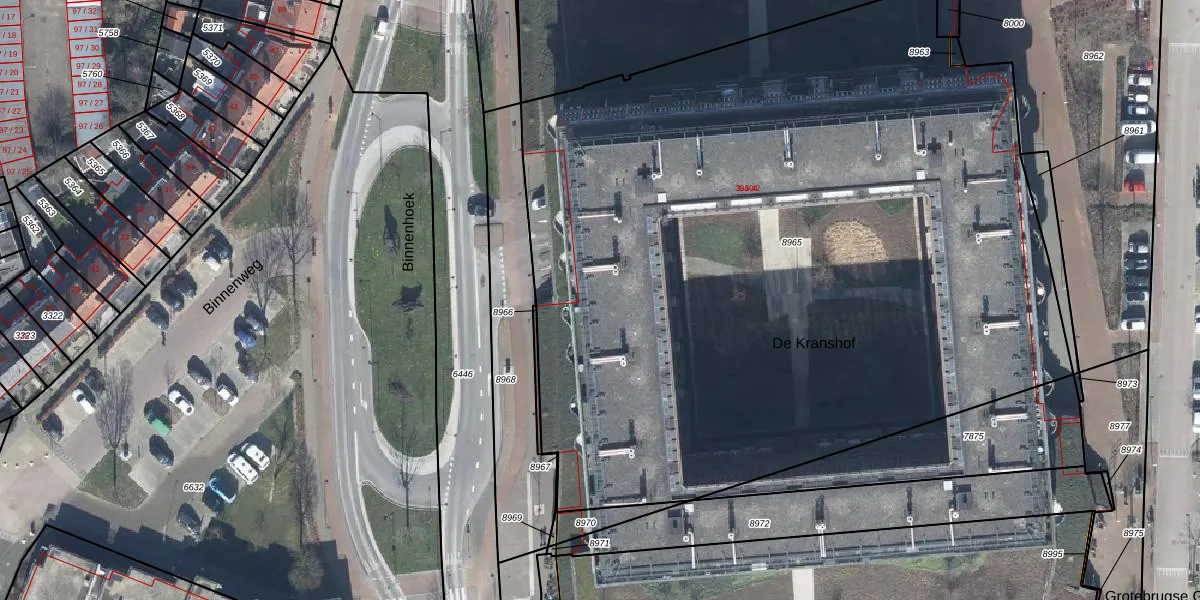 Het perceel waarop De Kranshof 208 staat heeft een oppervlakte van 5840 m². Dit is een zeer groot perceel. De perceeloppervlakte wordt geregistreerd door het Kadaster. Gedetailleerde informatie over de maten van dit perceel kunt u vinden in het rapport Kadastrale kaart met maatvoering van De Kranshof 208.