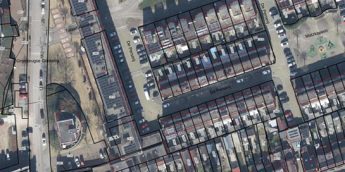 Het perceel waarop De Perserij 22 staat heeft een oppervlakte van 107 m². Dit is een middelgroot perceel. De perceeloppervlakte wordt geregistreerd door het Kadaster. Gedetailleerde informatie over de maten van dit perceel kunt u vinden in het rapport Kadastrale kaart met maatvoering van De Perserij 22.